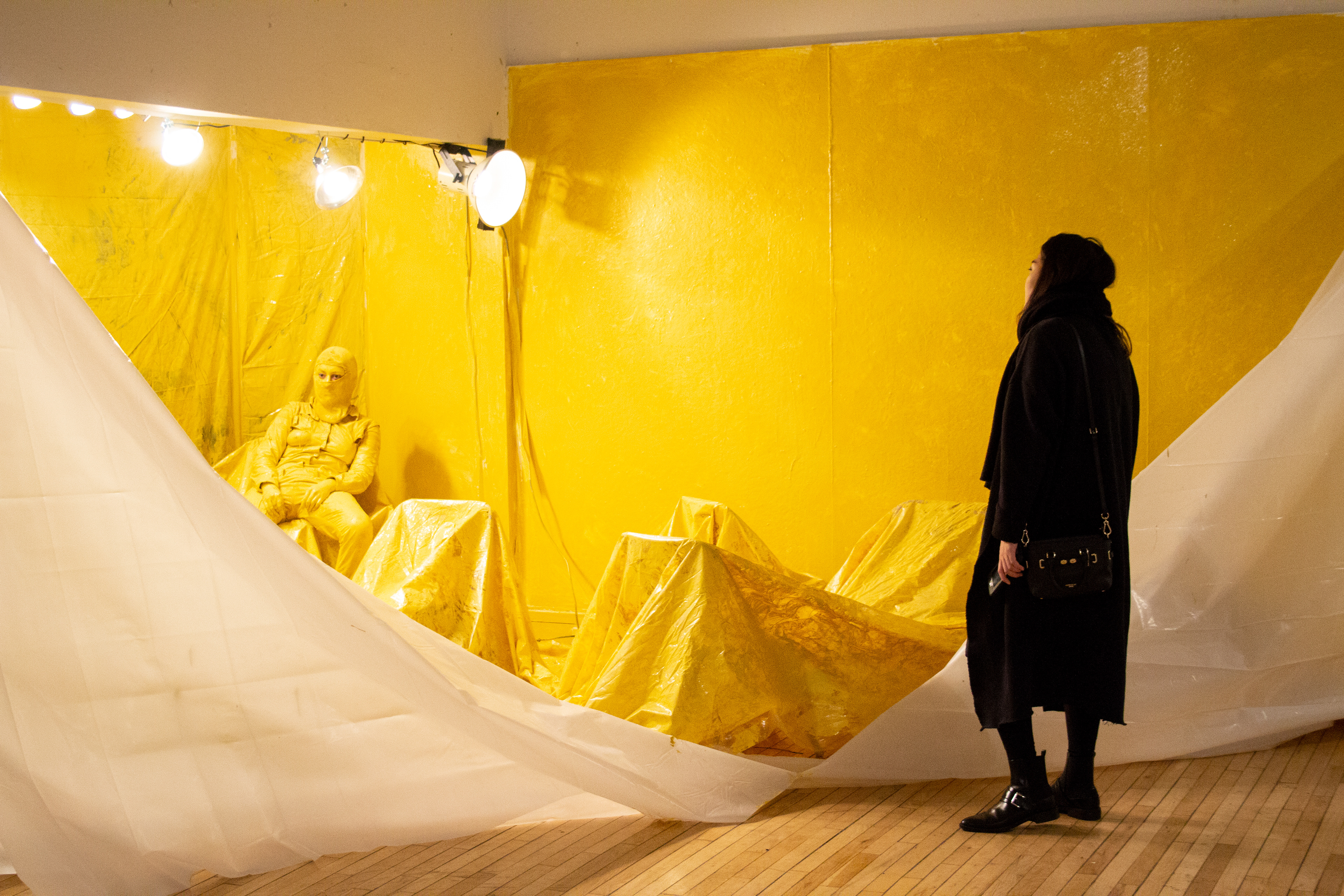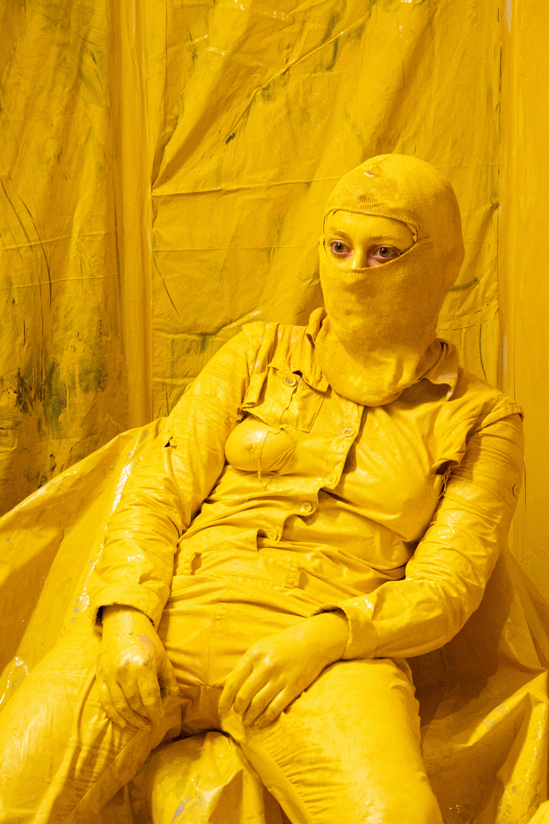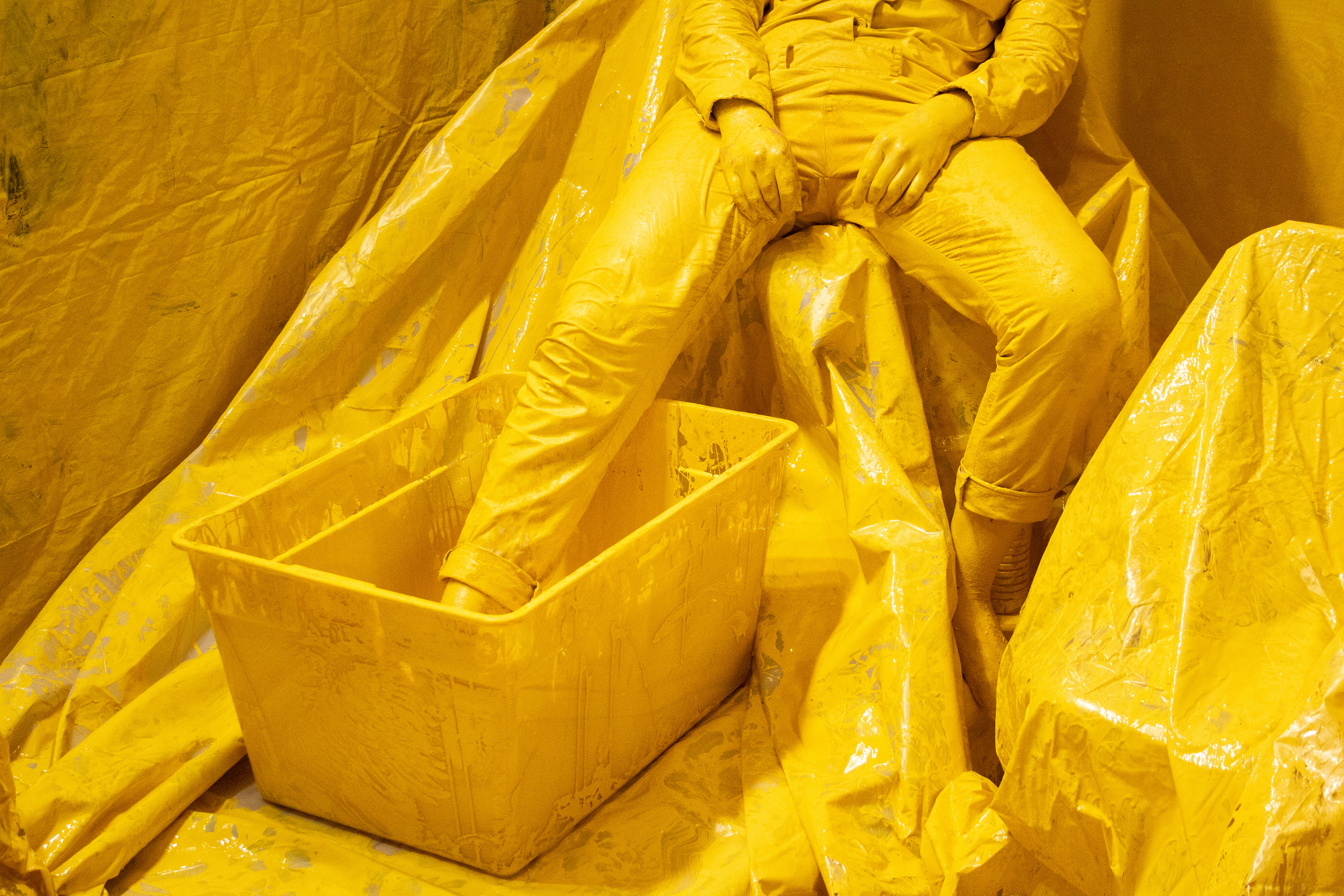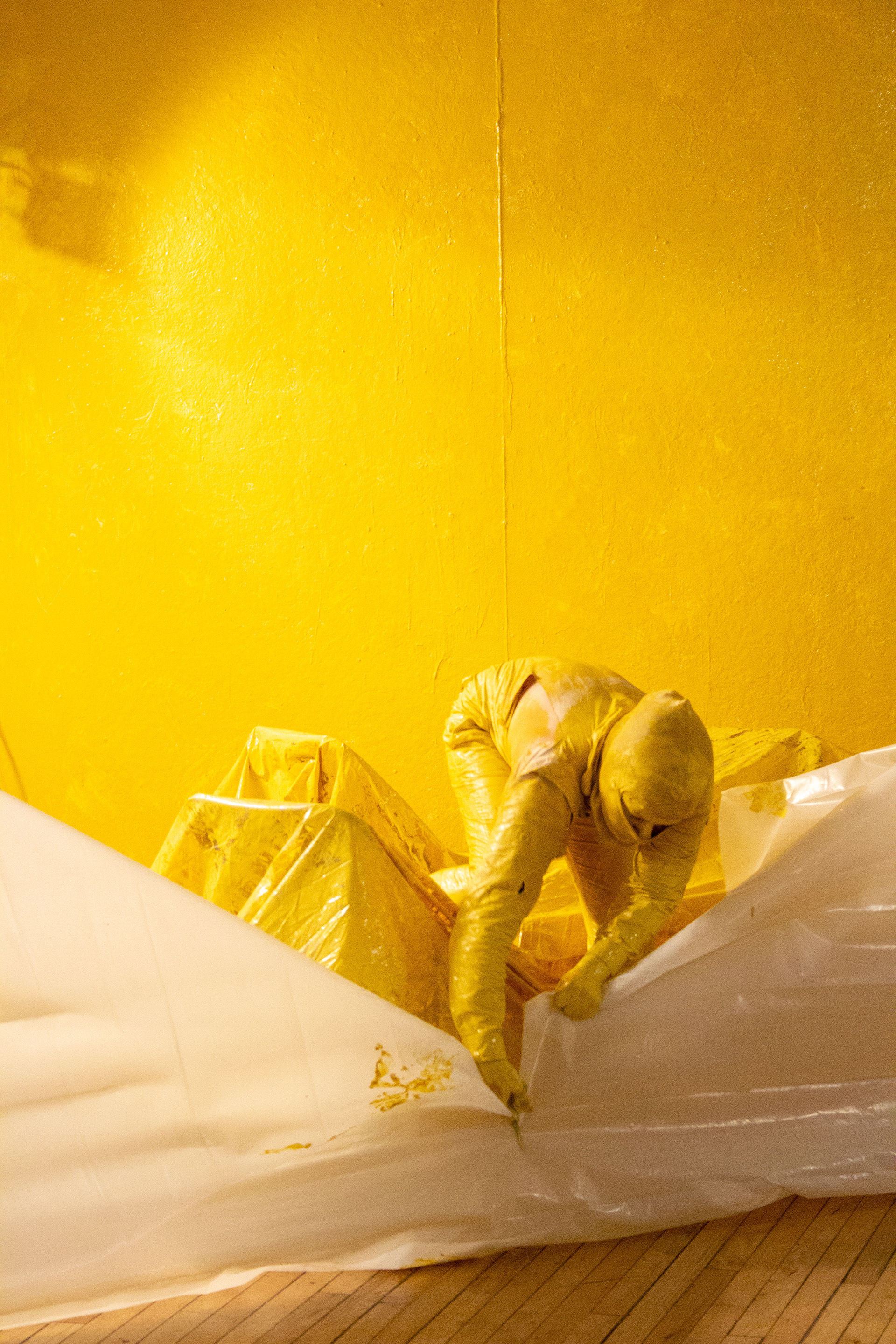 (or the proprietary bridge color of the city of Pittsburgh) 3 hour performance, Frame Gallery, Pgh allohmon yellow paint, pittsburgh resident, parking chairs, plastic sheeting p.c. Stephen Solomon
