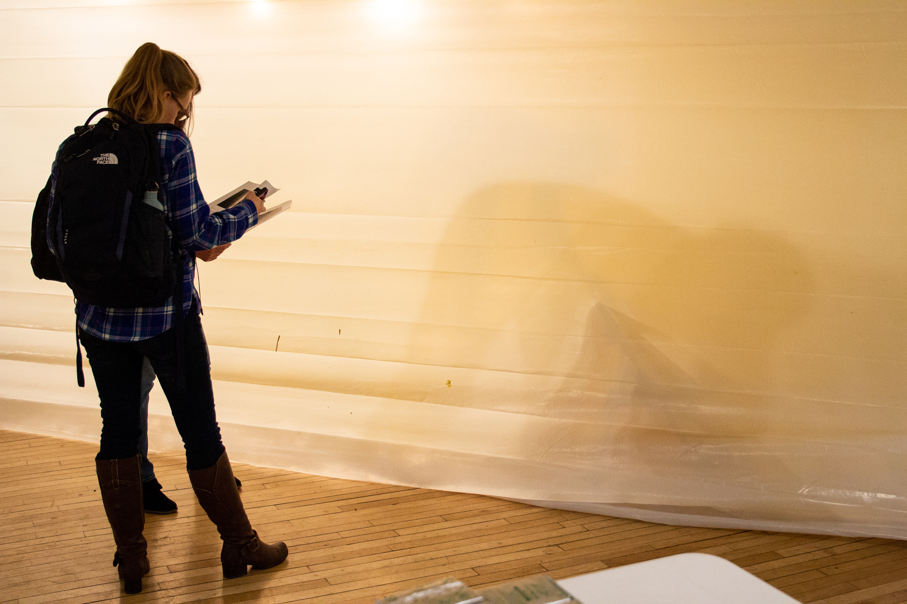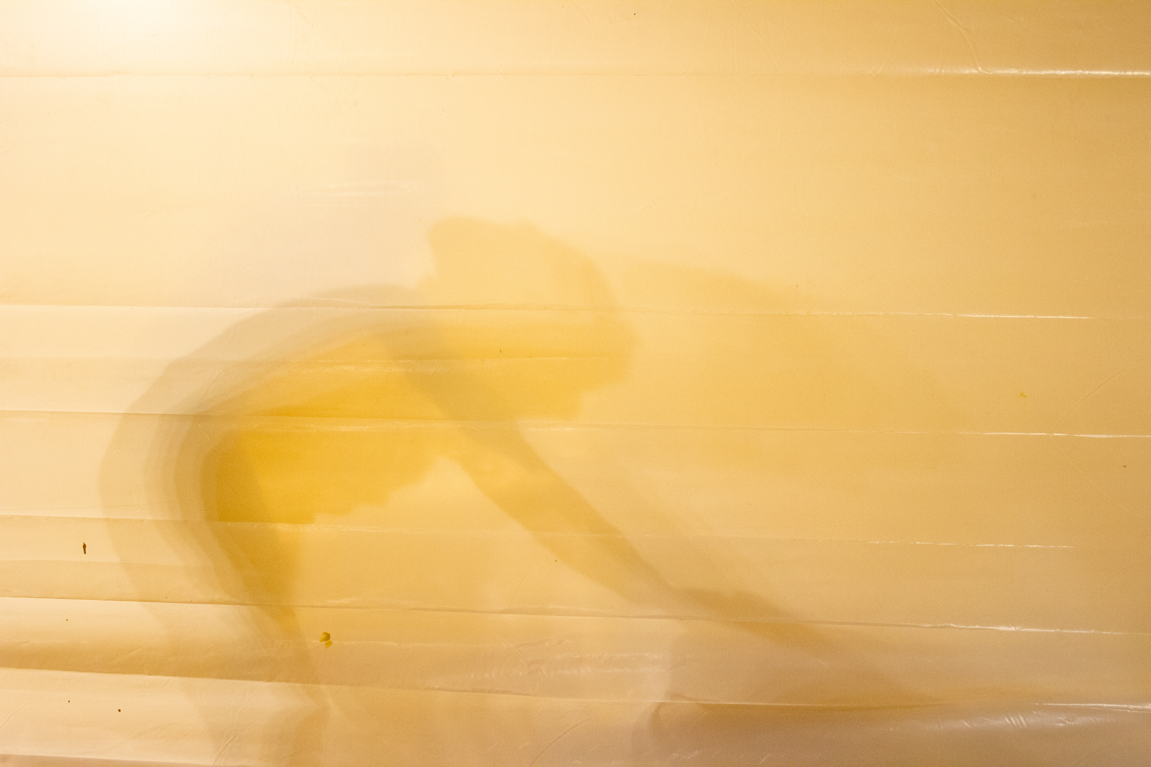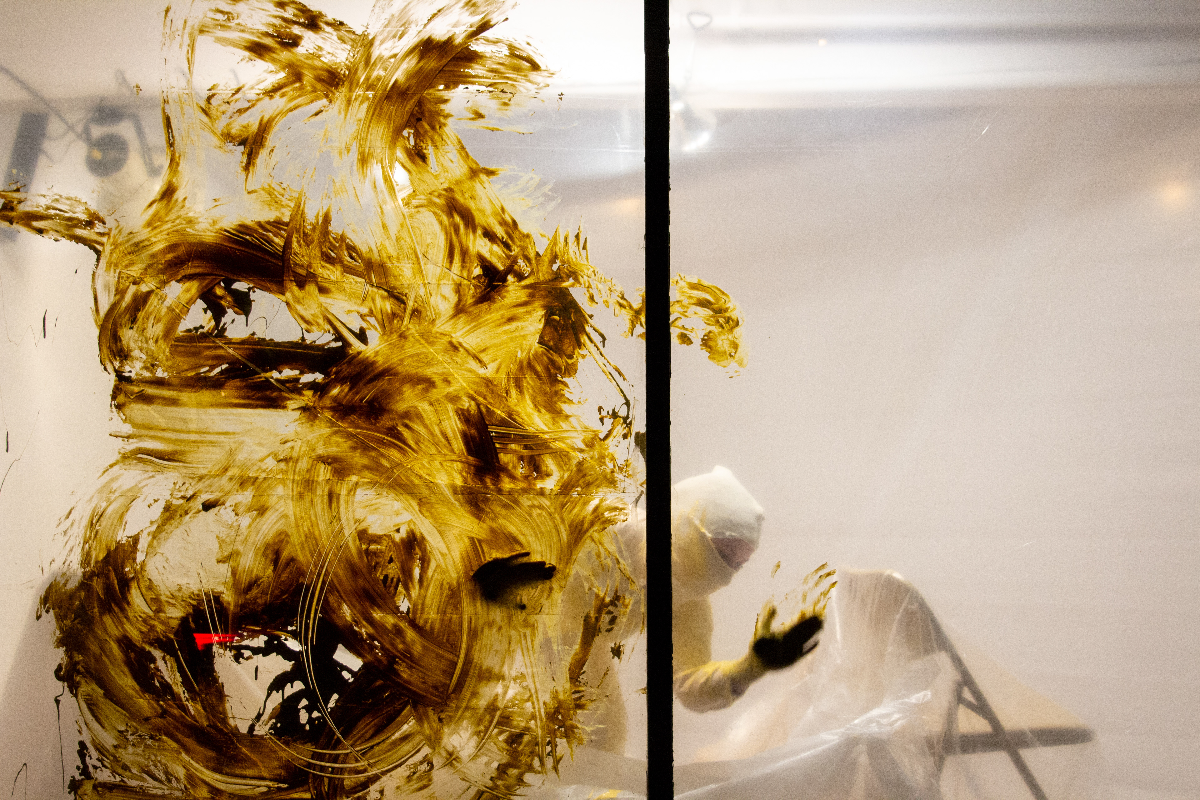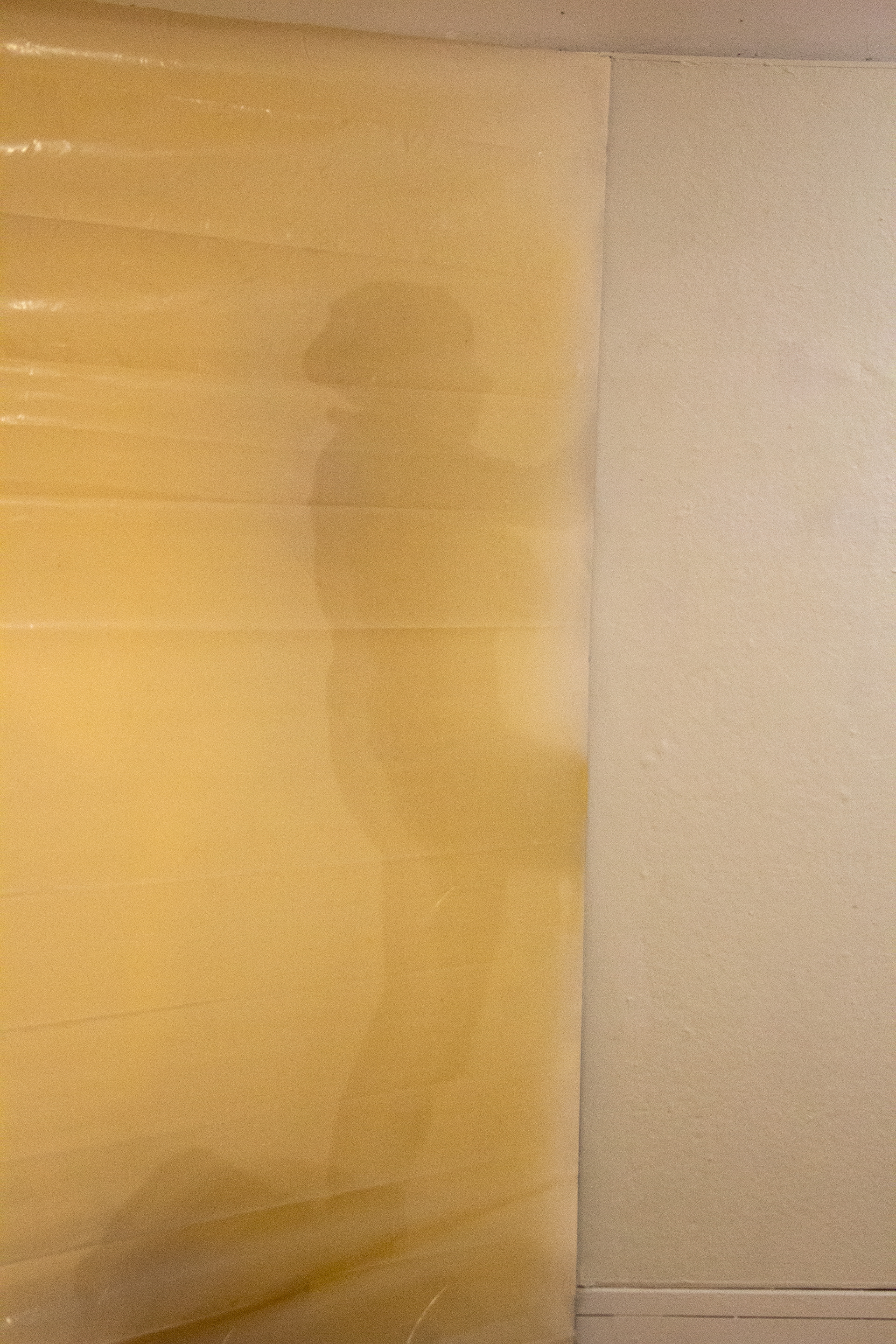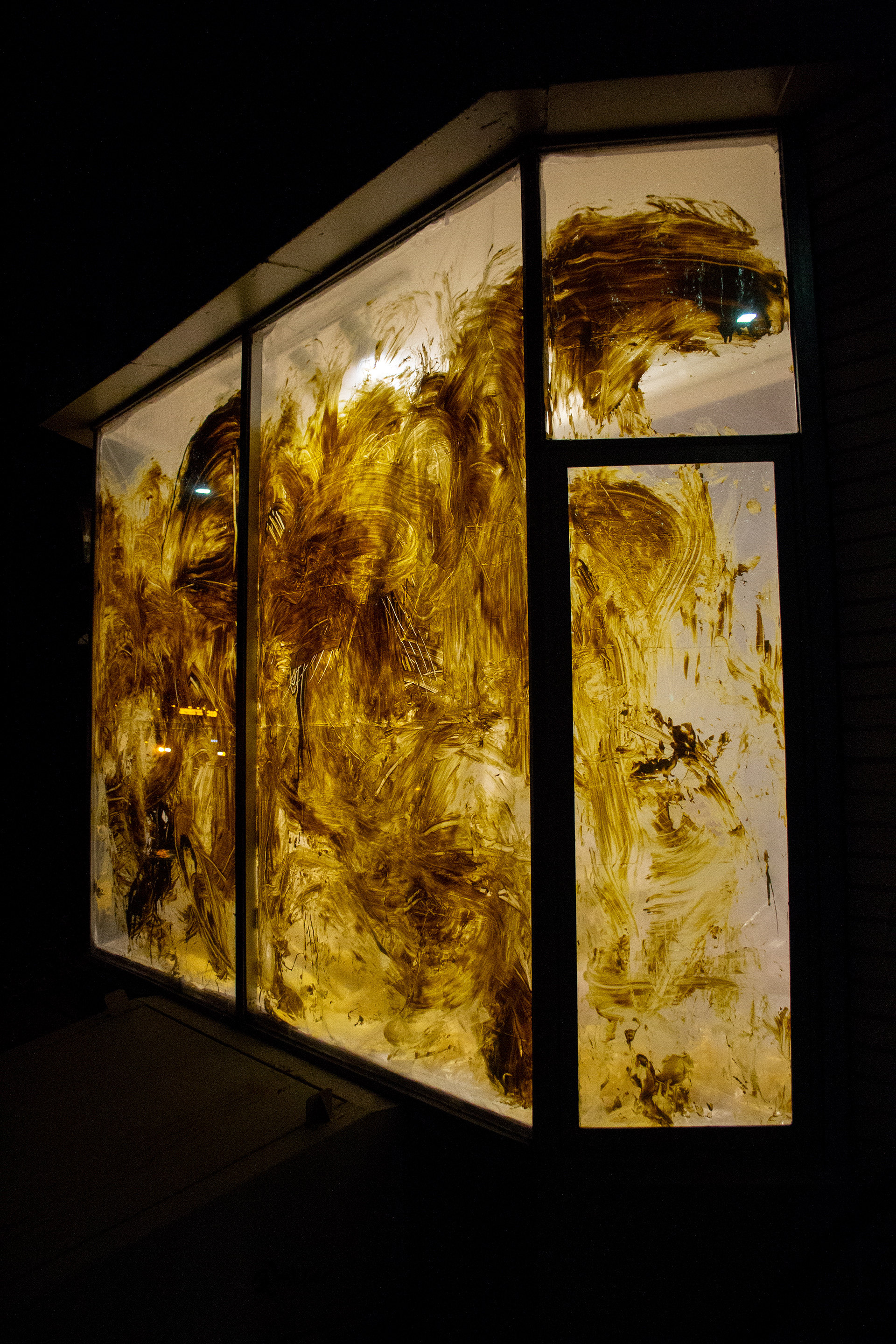 (or the proprietary bridge color of the city of Pittsburgh) 3 hour performance, Frame Gallery, Pgh allohmon yellow paint, pittsburgh resident, parking chairs, plastic sheeting p.c. Stephen Solomon
